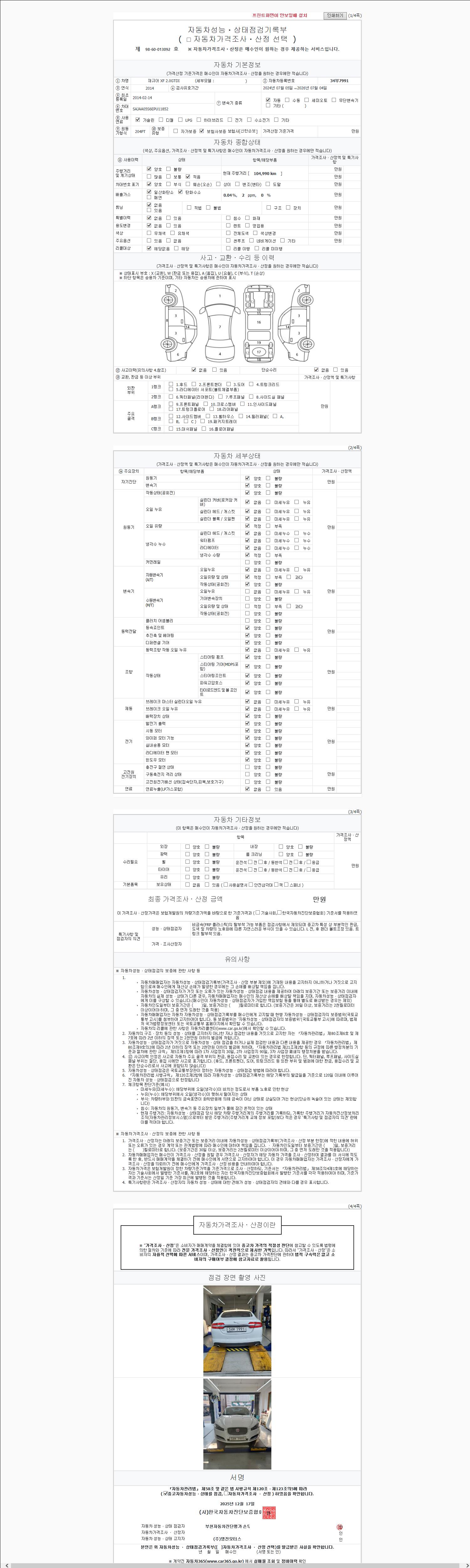 | 주행거리 | 100,000 km | 차량번호 | 34부7991 | 사고유무 | 성능기록부 참조 | 제시번호 | 제 2025232882 호 |