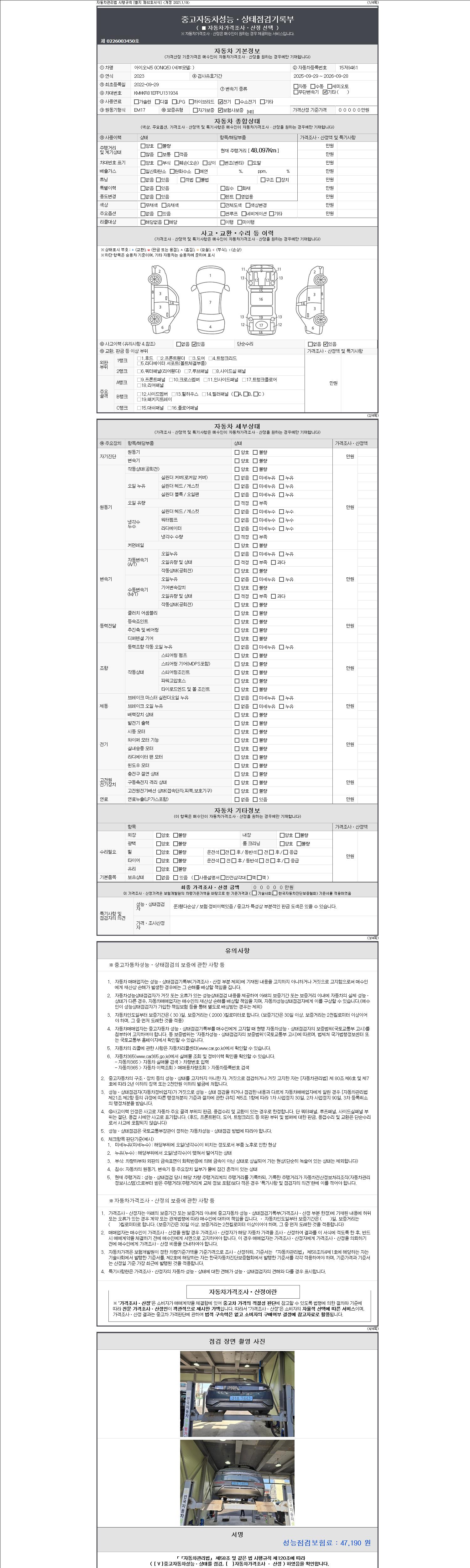 | 주행거리 | 48,097 km | 차량번호 | 15저9461 | 사고유무 | 성능기록부 참조 | 제시번호 | 제 2147483647 호 |