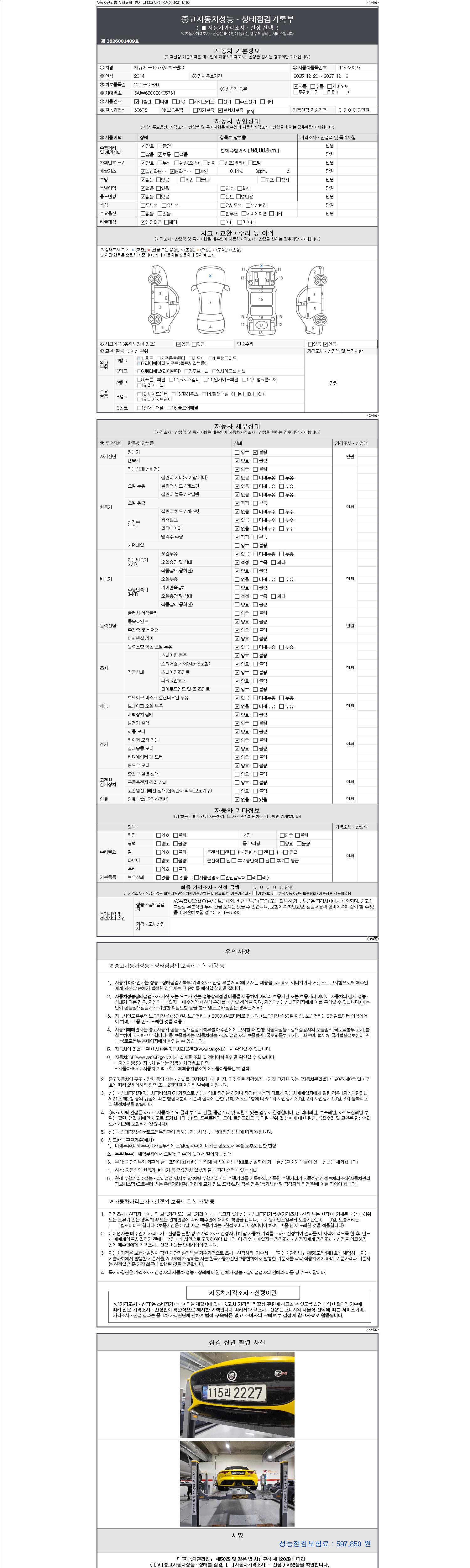 -중고자동차 매매업자를 통해 차량을 구입하실 경우 반드시 "중고자동차 성능, 상태점검 기록부"를 교뷰 받으셔야 하며, 매매업자는 반드시 의무 교부 하여야 압니다.