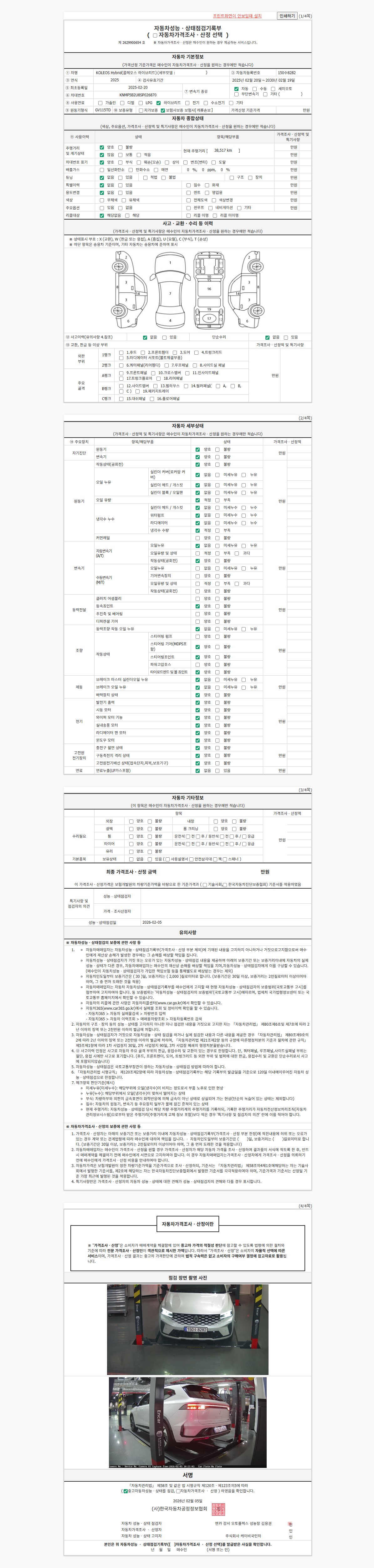 자동차관리법 시행규칙 제120조의 규정에 따라 별지 제 82호서식 《중고자동차 성능, 상태점검 기록부》를 발행한 성능, 상태점검자 및 매매자는 아래의 보증기간 또는 보증거리 이내의 중고자동차, 성능점검 기록부에 기재된 내용과 자동차의 실제 성능, 상태가 다른 경우 계약 또는 관계법령에 따라 매수인에 대하여 책임을 집니다.