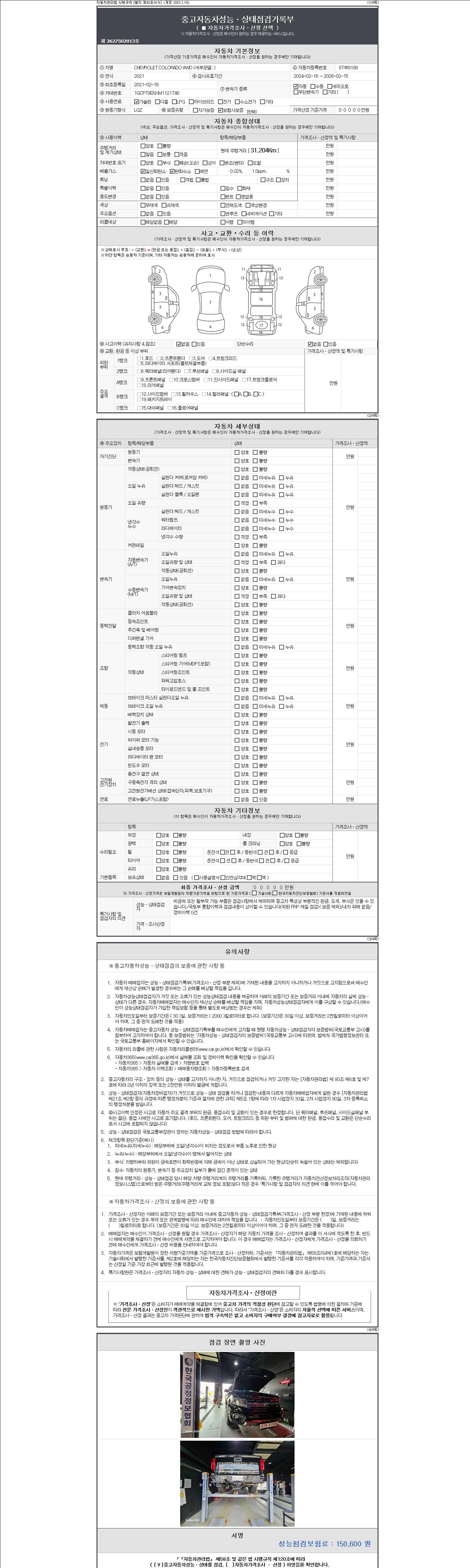자동차관리법 시행규칙 제120조의 규정에 따라 별지 제 82호서식 《중고자동차 성능, 상태점검 기록부》를 발행한 성능, 상태점검자 및 매매자는 아래의 보증기간 또는 보증거리 이내의 중고자동차, 성능점검 기록부에 기재된 내용과 자동차의 실제 성능, 상태가 다른 경우 계약 또는 관계법령에 따라 매수인에 대하여 책임을 집니다.